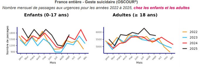 Pourtant Grande cause nationale en 2025, la santé mentale demeure un sujet tabou pour 70% des Français, selon un sondage Odoxa. Une statistique qui peut paraitre paradoxale quand Santé Publique France pointe la hausse des gestes et idées suicidaires chez les enfants et les adultes au cours de cette année 2025. En septembre 2025, près de 1 700 enfants (entre 0 et 17 ans) et 5 700 adultes sont passés aux urgences pour des gestes suicidaires.