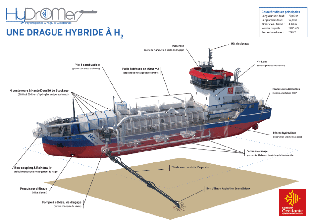 Bientôt, nous irons même plus loin puisque la drague sera alimentée grâce à de l’hydrogène vert produit localement à Port-La Nouvelle ! Une prouesse technologique unique au monde qui permettra une fois encore à l’Occitanie et à l’industrie navale française de s’illustrer.