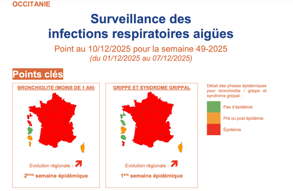L’épidémie de bronchiolite saisonnière s’accentue aussi dans notre région. En Occitanie, selon Santé publique France, les données de virologie montrent une intensification de la circulation du virus majoritairement responsable de la bronchiolite (VRS) chez les nourrissons et les indicateurs de recours aux soins continuent d’augmenter. La semaine dernière, la bronchiolite chez les moins de 1 an a entrainé 177 passages dans les services d’urgence dont 62 ont nécessité une hospitalisation (Semaine du 1er au 7 décembre).