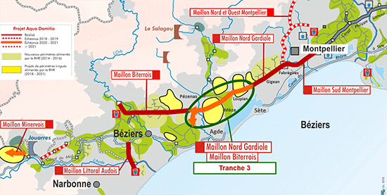 Fabrice Verdier : Il s’agit d’un projet d’extension hydraulique régional d’une longueur de 140 km, de Montpellier, jusqu’au Biterrois et au Narbonnais. Le transfert d’eau est de l’ordre de 2,5 m3 / seconde, soit 12 millions de m3 par an. Il reste un surpresseur à réaliser et deux maillons à poursuivre, le maillon minervois dans l’Aude, et le maillon au nord de Montpellier dans l’Hérault. 40M€ de réseaux secondaires hydroagricoles ont été réalisés pour près de 6 000 d’hectares équipés à l’irrigation à terme. Nous sommes à 80 % de l’objectif de réalisation pour un coût total du projet de 220M€.