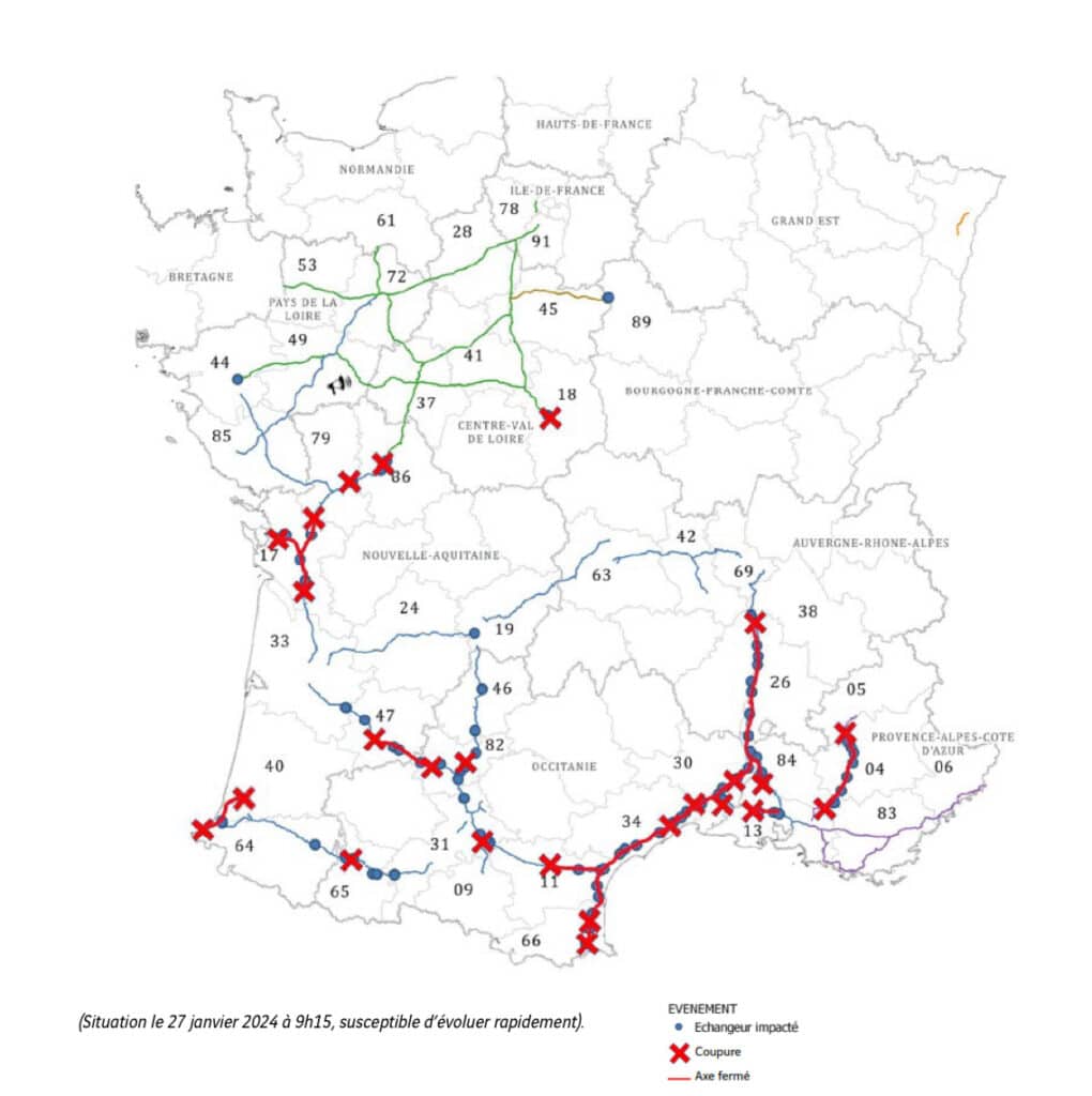 Des manifestations entravant la circulation ont lieu sur le réseau VINCI Autoroutes, impliquant des fermetures d’axe prises par les autorités préfectorales (liste non exhaustive susceptible d’évolution rapide) :