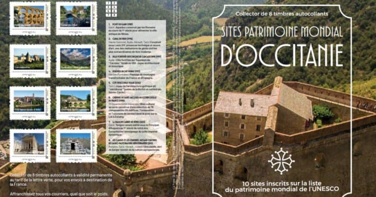 Le Pont du Gard, le Canal du midi, la ville fortifiée de Carcassonne, le site des Pyrénées-Mont perdu, la Cité épiscopale d’Albi, les chemins de Saint-Jacques de Compostelle, la Maison carrée de Nîmes, les Causses et Cévennes, les fortifications Vauban des Pyrénées ou encore la réserve naturelle de la forêt de la Massane seront tous représentés sur le nouveau collector de timbres émis par La Poste.