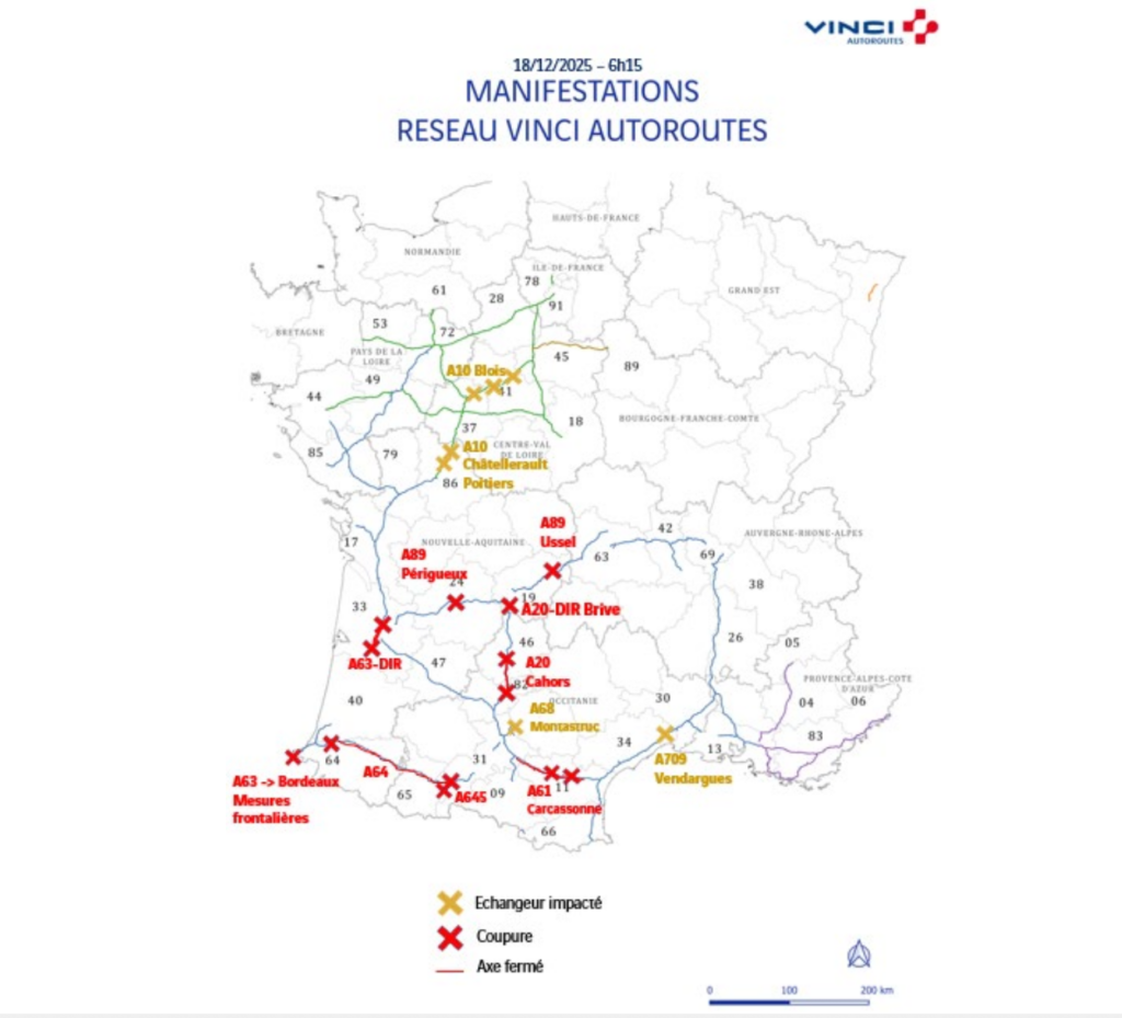 Ce jeudi 18 décembre, VINCI Autoroutes fait un point de situation à 6h15, suite aux mobilisations agricoles. Les blocages se poursuivent et évoluent, avec des perturbations majeures sur le réseau autoroutier.