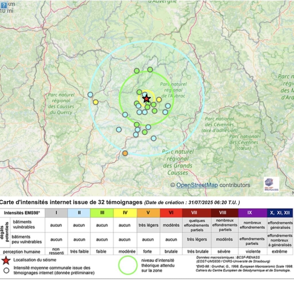 Un tremblement de terre s’est produit la nuit dernière, ce jeudi 31 juillet 2025 en Occitanie. Le séisme a été enregistré à 4h53 du matin ce jeudi, dans le département de l’Aveyron. L’épicentre se situe au Nord de la commune de Rodez, dans le secteur de Sébrazac. La profondeur du foyer est de 6,9 km. De nombreux témoignages de personnes ayant ressenti une secousse ou un grand bruit peuvent être lus sur les réseaux sociaux ce matin, notamment sur la page Facebook de Météo Aveyron 12 ICI.