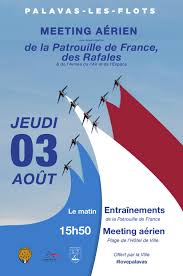 Si vous êtes dans l’Hérault ce jeudi 03 août, ne manquez pas ce grand rendez-vous aérien. Que vous soyez amateur d’aviation, de sensations fortes ou simplement curieux, ce spectacle est fait pour vous. Venez nombreux à Palavas-les-Flots pour vivre une journée inoubliable sous le signe de l’émotion et de l’adrénaline.