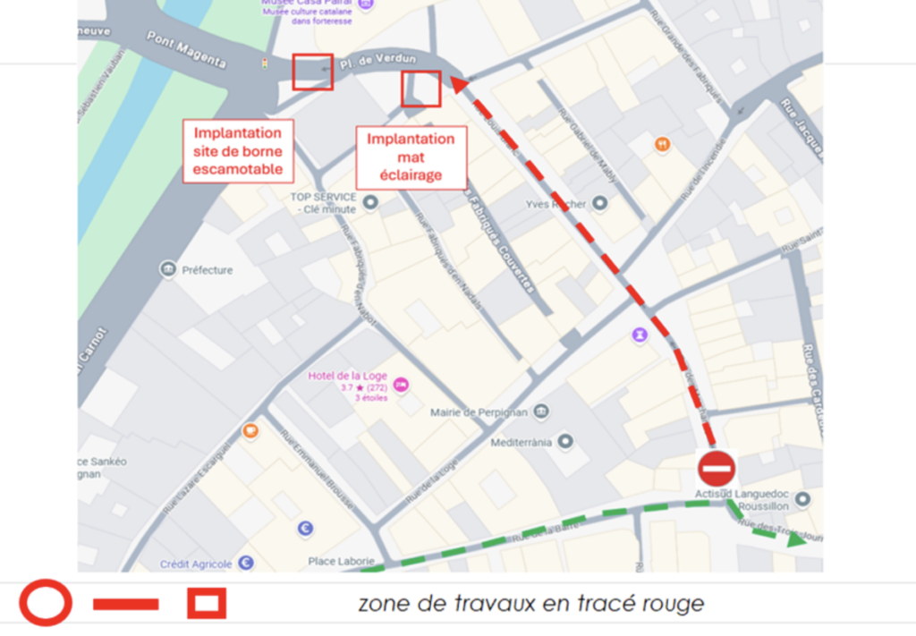 Des travaux seront réalisés sur la place de Verdun dans le centre-ville de Perpignan le lundi 23 mars, mardi 24 mars et mardi 7 avril 2026. Au programme : pose d’une borne escamotable (sortie Pont Magenta) et d’un mat d’éclairage public (côté rue Louis Blanc). La circulation sera donc interrompue sur la place de Verdun de 6 heures à 17 heures. La circulation sera ponctuellement déviée par la Porte Notre Dame en provenance de la rue des Marchands.