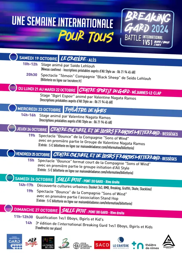 Coorganisé par le Conseil départemental et l’association All’style, le Breaking Gard 2024 va regrouper les meilleurs « Bgirls et Bboys » internationaux du moment, certains ayant participé aux JO de Paris 2024. Dès le matin les Bboys, les Bgirls et les Kids de la région pourront tenter de remporter les 2 places en qualification leur permettant de se mesurer l’après-midi aux 6 invités internationaux.