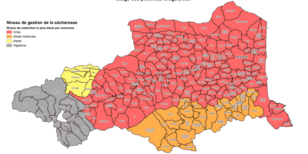 Au regard de cet arrêté, la préfecture des Pyrénées-Orientales a publié une liste des communes par zone d’alerte, dont la plupart sont considérées en « crise », compte tenu de la disponibilité de la ressource en eau. Voici la carte des communes :