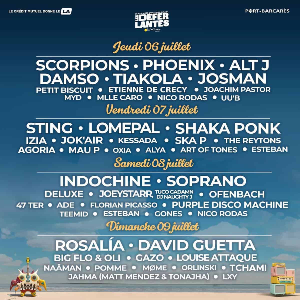 De nombreux artistes français vont encore frôler la scène des Déferlantes cette année et il y en a pour tous les goûts ! En allant de Damso et Petit Biscuit le 6 juillet, puis en passant par Soprano, Indochine ou encore 47Ter le 8 juillet ou encore par David Guetta et Big Flo & Oli le 9 juillet; tous les univers musicaux sont bien représentés.
