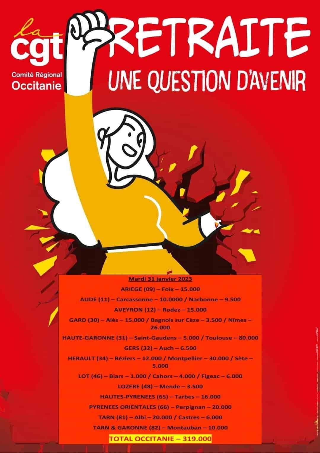 En Occitanie, 319 000 personnes ont manifesté selon la CGT. Dans le Gard, il y avait 3500 personnes à Bagnols-sur-Cèze, 15 000 personnes à Alès et 25 000 personnes à Nîmes. Dans l’Hérault, 5000 personnes à Sète, 12 000 personnes à Béziers et 30 000 personnes à Montpellier. Dans la capitale de l’Occitanie, à Toulouse en Haute-Garonne, il y avait 80 000 personnes, toujours selon la CGT.