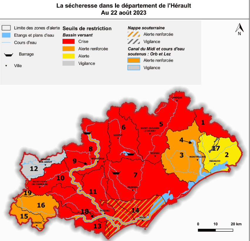 Ainsi, le bassin versant de la Cesse est désormais en alerte renforcée, tandis que les bassins versants de la Lergue, de l’Orb (amont et aval, à l’exception de son axe soutenu), de l’Hérault (amont et aval), du Jaur, de l’Aude (aval), de Berre-Rieu et du Vidourle restent en crise. Les bassins versants de l’Hérault aval, de l’axe soutenu de l’Orb, de l’Argent double et de l’Ognon, du Jaur, de la Mosson, du Lez (à l’exception de son axe soutenu), du canal du Midi (dans sa partie héraultaise), du Thoré amont, ainsi que la nappe Astienne, sont maintenus en alerte renforcée.