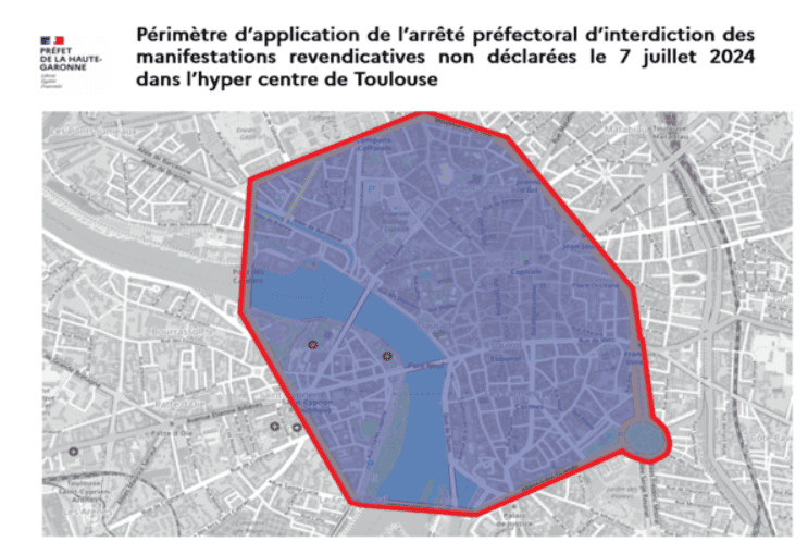 Tout d’abord, un périmètre d’interdiction des rassemblements revendicatifs non déclarés et manifestations va être dressé dans l’hypercentre de la ville de Toulouse. Cette mesure s’applique du dimanche 7 juillet 18 heures jusqu’au lundi 8 juillet à 4 heures du matin, dans le périmètre délimité par les voies suivantes :