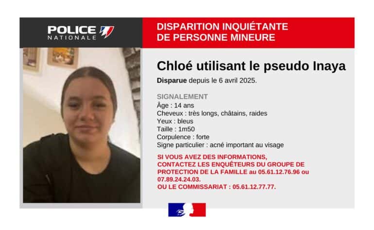 Chloé, qui utilise aussi le pseudo « Inaya », est une adolescente âgée de 14 ans aux cheveux très longs, châtains et raides. Elle a les yeux bleus, mesure 1m50 et a une forte corpulence. Elle a également beaucoup d’acné sur le visage. Si vous avez des informations, vous devez prendre contact avec les enquêteurs du groupe de protection de la famille au 05.61.12.76.96 ou le commissariat au 05.61.12.77.77.