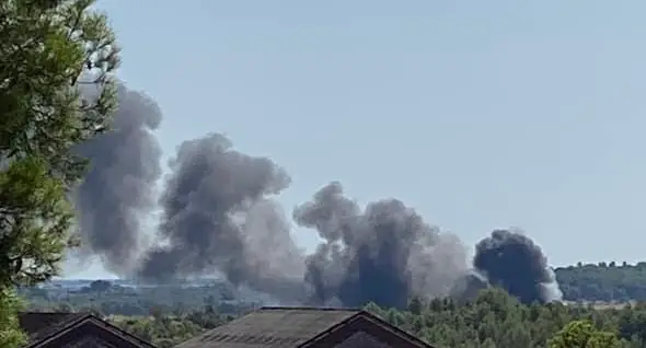 Un épais panache de fumée noire s’élève au-dessus du site, visible à plusieurs kilomètres à la ronde.