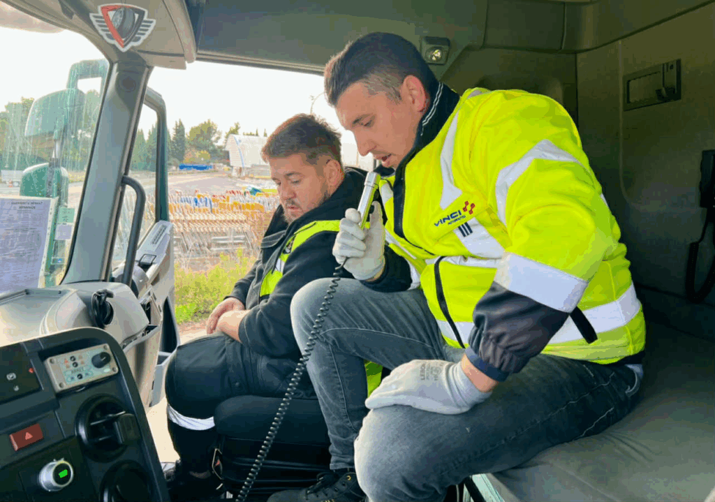 David, l’un des quatre conducteurs de travaux du centre de Gallargues, sensibilise sur les comportements dangereux. « Il est interdit de doubler un engin qui déneige. On voit trop de routiers et de véhicules légers le faire », prévient-il, avant de préciser : « Vinci a une convention avec les entreprises partenaires du 15 novembre au 15 mars 2025, pour la mise à disposition des chauffeurs et des camions ». Pour chaque intervention, un trio est constitué de deux équipiers prestataires et d’un membre interne de chez Vinci, mobilisés ainsi sur les trois voies. Après la session de manoeuvres ce matin, place aux ateliers théoriques pour la dizaine de conducteurs. Extrait vidéo du centre de Gallargues à découvrir ci-dessous :